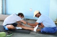 Pa loke ta e trabounan na e piscina, nos tin cu bisa cu nos por a mira e diferente tentnan poni, mientras e personal di Brandweer a bin duna un man pa finalisa e trabounan. Na banda di e pone startblokken nan nobo, a drecha tambe e scoreboard cu luznan mas briyante. Na Mangel Halto diferente landador a test e 1km di Open Water. Comision tecnico di COA y Cemedar Sports Medicine cu ta percura pa e cuido medico di nos atletanan a duna e landadornan e ultimo massaga, tambe Dr. Mejia duna algun di e atletanan ehercicio di flexibilidad.